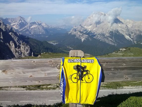 Aprovechamos para inmortalizar el momento, en la base de los tres colosos: el grande, el pequeño y el del lado oeste. Yo hoy visto mi equipación de la maglia rosa. Por algo estamos en Italia, tierra de la carrera que probablemente es la más atractiva del calendario internacional, el Giro. Obviamente, cual Neil Armstrong alunizando, colocamos un maillot de Rodadores por bandera para la posteridad. No sé si alunizamos, pero desde luego estamos alucinando. No hay postal que supere lo que están viendo nuestros ojos.