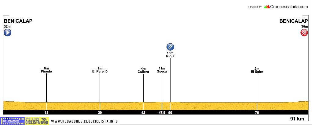 Bordeamos la costa valencia para llegar a orillas del rio Xúquer en la población de Riola. Etapa propicia para rodar agrupados y a relevos con más motivos si el viento sopla con fuerza al paso por Sueca