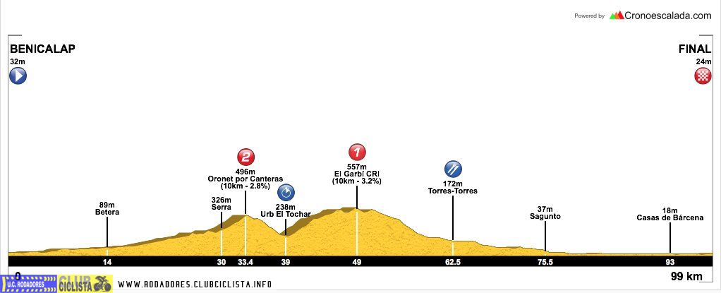 Que la disminución de los km no os lleven a engaño. Se trata de una de las etapas más duras del año si tenemos en cuenta la prueba contra el crono, una crono-escalada en toda regla hasta la cima de El Garbí.