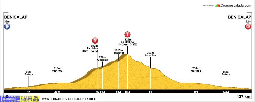 Etapa clásica a la población de Alcublas con su subida como dificultad montañosa. Para los que deseen más kilometros y desnivel, tenemos la ascensión a La Bellida unos de los puertos de mayor altitud de la comunidad que sobrepasa los 1000 m.