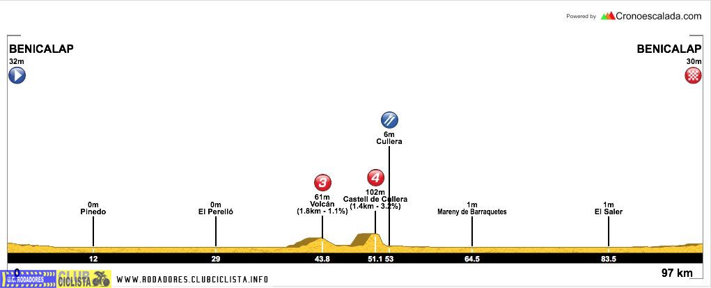 Recorrido análogo al de la Marcha Cicloturística de Valencia pero en esta ocasión no nos adentraremos por los arrozales de Sueca sino que iremos rectos hasta Cullera para subir al Volcán y al Castell, ambas ascensiones son cortas pero con tramos explosivos de grandes porcentajes.