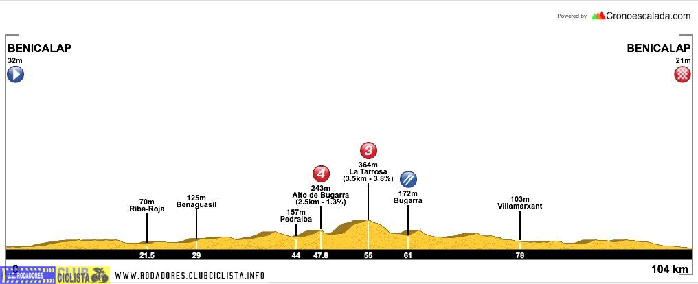 Incursión por la comarca de Los Serranos en la localidad de Bugarra. Saldremos por Riba-Roja para desviarnos hacia Benaguacil y a partir de allí coger la carretera CV-364 que nos llevará hasta Pedralba por un terreno lleno de repechos. Tras superar el alto de Bugarra, los que deseen, podrán continuar hasta el desvio a la derecha que nos subirá hasta el alto de La Tarrosa con su rampa final de infarto. Tras el almuerzo a orillas del Turia volveremos a casa por el recorrido habitual.