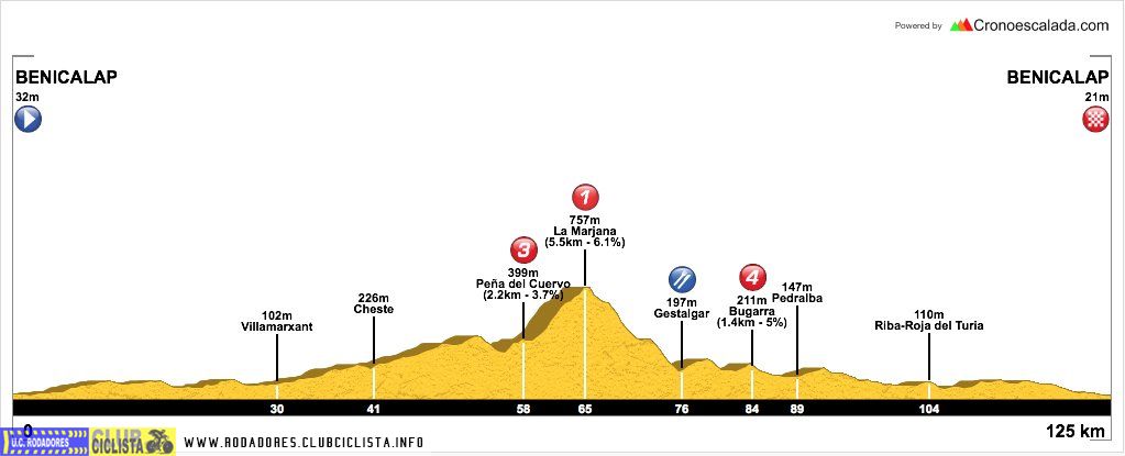 | Alto Bugarra por Bugarra ![]() | 3,68 km | 129 m | 2,6 % | 12 % | 240 m | Asfalto óptimo |