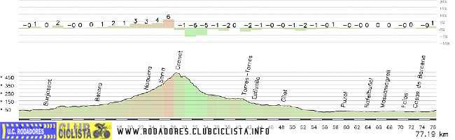 | Oronet por Serra ![]() | 3,08 km | 163 m | 5,3 % | 6 % | 499 m | 25 | Asfalto óptimo |