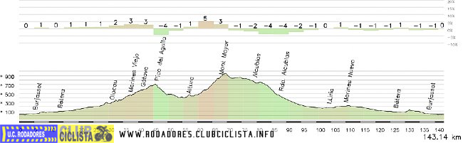 | Monte Mayor por Altura ![]() | 14,11 km | 620 m | 4 % | 8 % | 990 m | 99 | Asfalto óptimo |