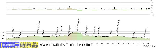 | Alto Gestalgar por Gestalgar ![]() | 3,3 km | 193 m | 5,8 % | 10 % | 380 m | 37 | Asfalto irregular Asfalto óptimo |