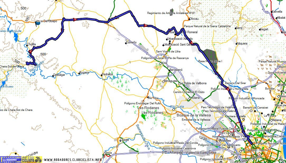 Ida: Burjassot, Bétera, Casinos, Vanacloig, La Ermita, Puerto Las Muelas 467 m., (Chulilla o Sot de Chera Ret. El Cerrao Tel. 961 04 99 62)