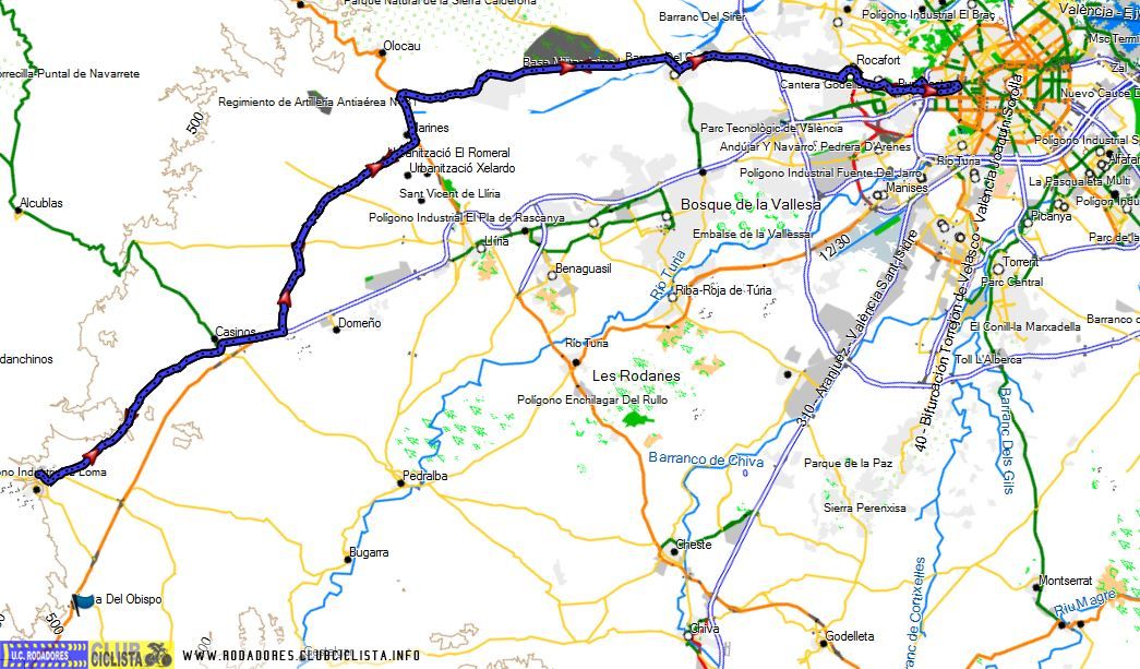 -Ida: Burjassot, Bétera, Marines, Urb. El Romeral, Casinos, Villar del Arzobispo, Opción La Buitrera 780 m, (Villar del Arzobispo Ret. La Loma Tel. 684 41 27 79).