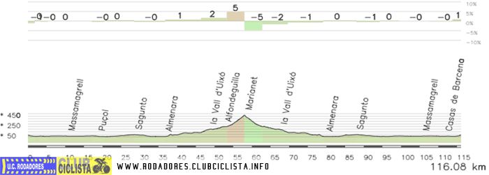 | Marianet por Vall d'Uxo ![]() | 8,58 km | 292 m | 3,3 % | 6 % | 400 m | 43 | Asfalto óptimo |