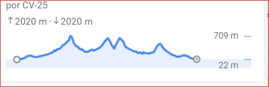 | Eslida por Chovar ![]() | 5,56 km | 253 m | 4,6 % | 10 % | 633 m | 35 | Asfalto óptimo |
