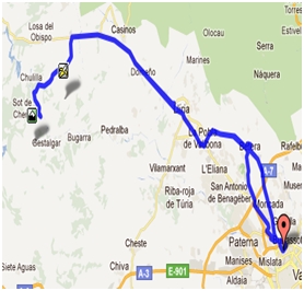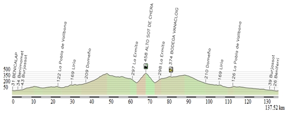 km LUGAR DE PASO 0 Sede Portalet 5 Burjassot (fin neutralización) 11 Mas Camarena 15 Bétera 31 Marines 50 Casinos (reagrupamiento grupo A) 62 Bodegas Vanacloig 70 Chulilla 77 Alto de Sot de Chera (PM 2ª Categoría) 83 CHULILLA (Almuerzo) 91 Bodegas Vanacloig 103 Casinos 123 Bétera 153 Sede Portalet
