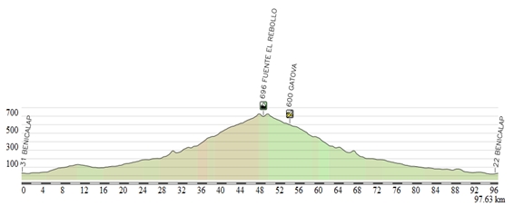 Última etapa con puerto de montaña de la temporada. Salida por Mas Camarena, para adentrarnos de lleno en el conocido trayecto hacia Gátova. En el tramo posterior a esta población está la salida a la izquierda hacia la Fuente del Rebollo. La vuelta se realizará por el camino habitual de Olocau y Bétera.