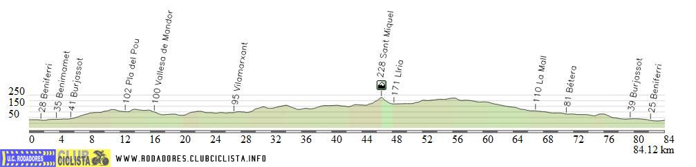 OPCIÓN B: BENICALAP - L'ANDANA (fin tramo neutralizado Grupo A) - RIBARROJA - CAMÍ DE LES MALLADES - SAN MIGUEL - LLÍRIA (Almuerzo) - MARINES NOU - BÉTERA (reagrup.) - CLUB DE TENIS - BENICALAP. (80 km.)